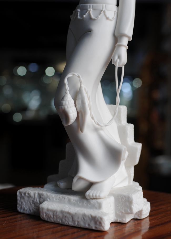 早在明代德化白瓷就名聲在外,一代“瓷圣”何朝宗名作流傳后世,成為世界各大博物館收藏的珍品,更對(duì)雕塑史上產(chǎn)生深遠(yuǎn)的影響,形成“何派”雕塑,其開(kāi)創(chuàng)的捏、塑、雕、刻、刮、削、接、貼八字技法延用至今。何派雕塑注重于細(xì)節(jié)之美,精益求精,故而十分著意衣紋的刻畫(huà),使線條流暢,翻轉(zhuǎn)自然。觀其作品仿佛有春風(fēng)拂面,衣袂飄揚(yáng)的出塵之感。