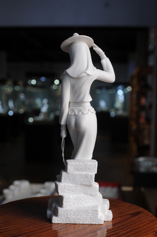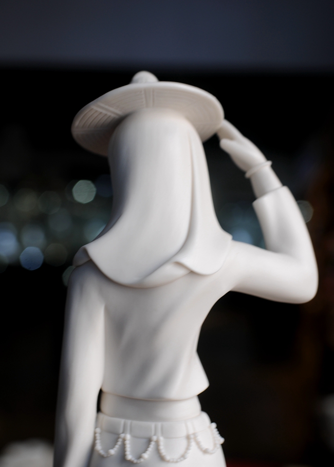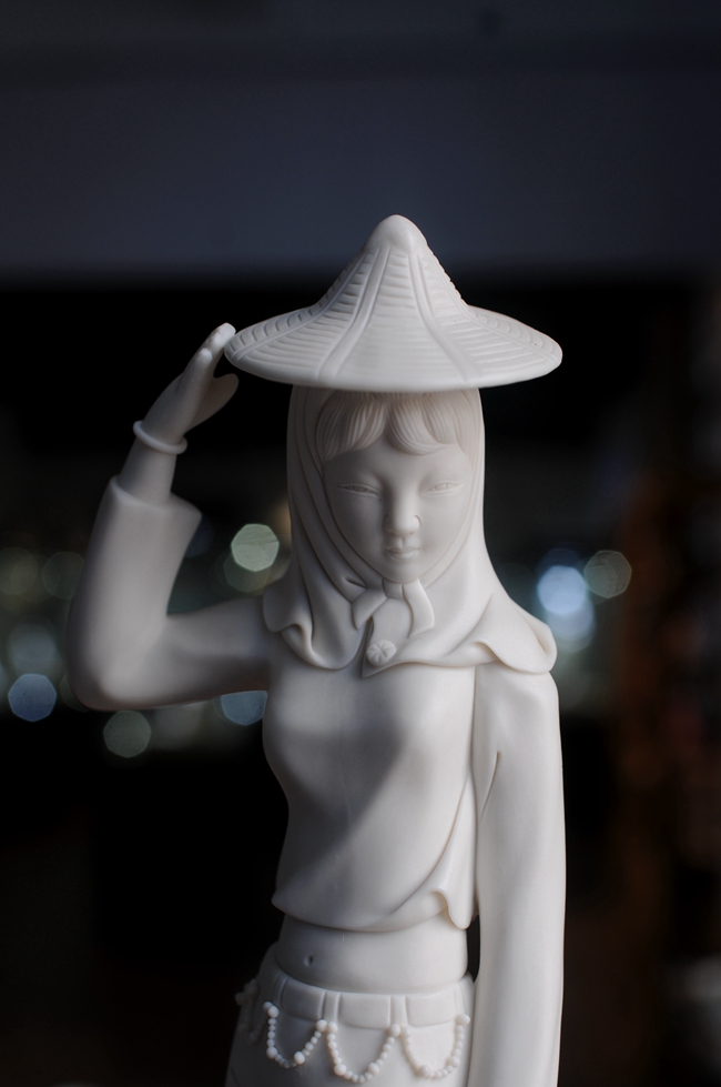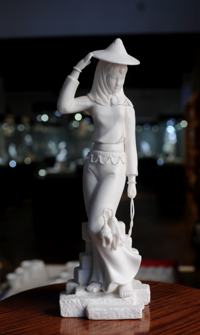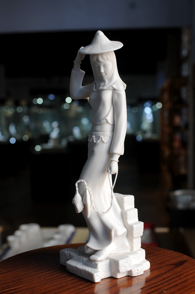 《趕!酚晒に噹熢O(shè)計(jì)創(chuàng)作。作品以德化溫潤(rùn)如玉的德化白瓷為胎質(zhì),經(jīng)1300多度高溫?zé)疲ンw溫潤(rùn)如玉,胎體通透,溫潤(rùn)如玉,瓷感細(xì)膩。作品以寫(xiě)實(shí)雕塑手法,見(jiàn)一民間風(fēng)情女子,頭帶斗笠,頭巾捂住雙頰下頜,上身穿短狹斜襟衫,露出肚臍,下穿寬大黑褲,抬腳盤(pán)坐石子,獨(dú)具風(fēng)采。作品純手工雕刻,細(xì)致刻畫(huà),所到之處無(wú)不精細(xì)贊嘆,足見(jiàn)大師在創(chuàng)作時(shí)的獨(dú)運(yùn)匠心,作品有大師印章落款,兼具審美價(jià)值和收藏價(jià)值,是一件不可多得的收藏精品。是辦公、家居、書(shū)房裝飾擺設(shè)、禮贈(zèng)、收藏的好選擇。