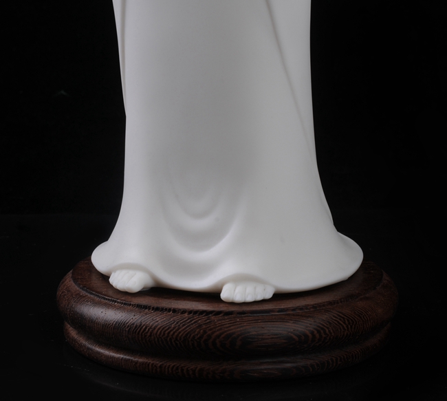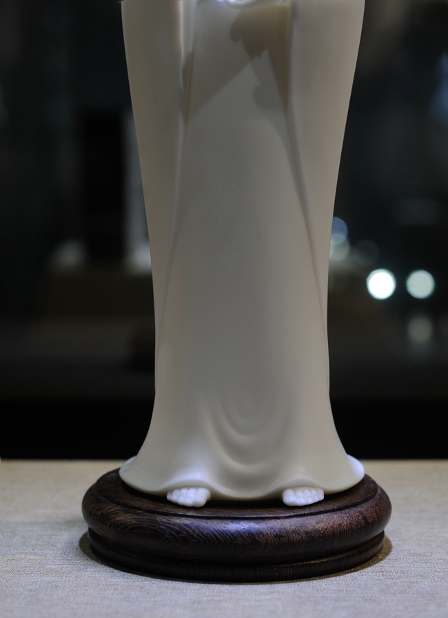 早在明代德化白瓷佛像就名聲在外,一代“瓷圣”何朝宗佛像名作流傳后世,成為世界各大博物館收藏的珍品,更對佛像雕塑史上產(chǎn)生深遠(yuǎn)的影響,形成“何派”雕塑,其開創(chuàng)的捏、塑、雕、刻、刮、削、接、貼八字技法延用至今。何派觀音雕塑注重于細(xì)節(jié)之美,精益求精,故而十分著意衣紋的刻畫,使線條流暢,翻轉(zhuǎn)自然。觀其佛像,仿佛有春風(fēng)拂面,衣袂飄揚(yáng)的出塵之感。