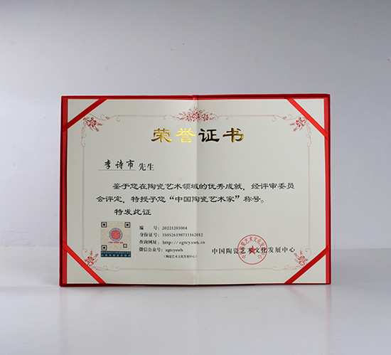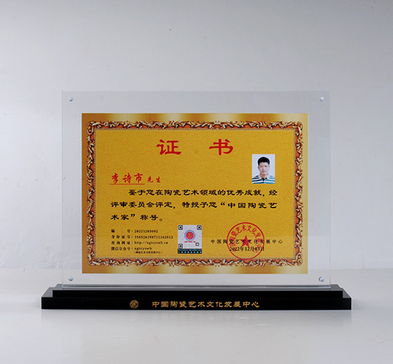 經(jīng)過(guò)多年的積累,李詩(shī)市創(chuàng)作出一系列優(yōu)秀作品,主要作品為茶器、藝術(shù)花盆、出口工藝品等,其作品深受廣大客戶喜歡,多件作品榮獲各評(píng)比金獎(jiǎng),2022年被中國(guó)陶瓷藝術(shù)文化發(fā)展中心評(píng)選為“中國(guó)陶瓷藝術(shù)家”。