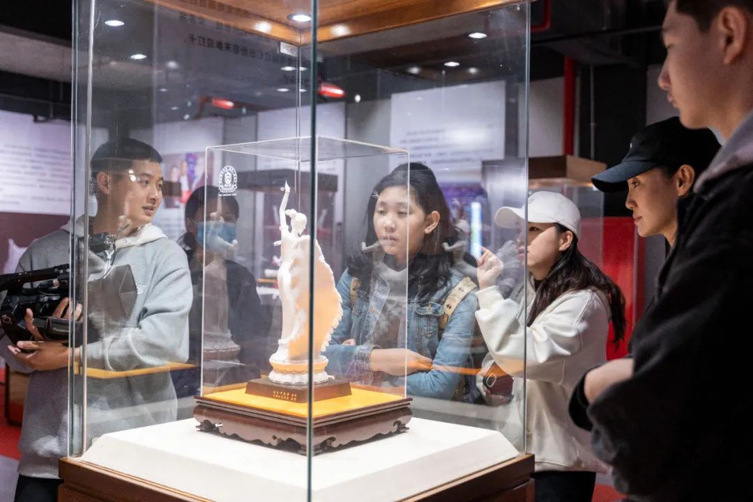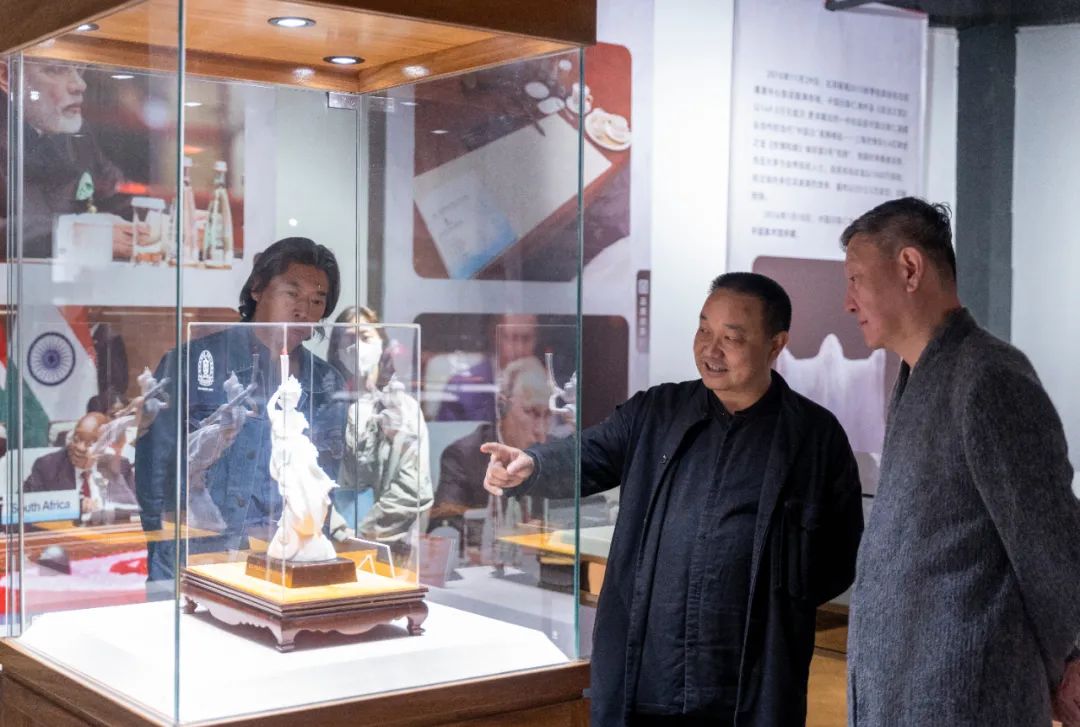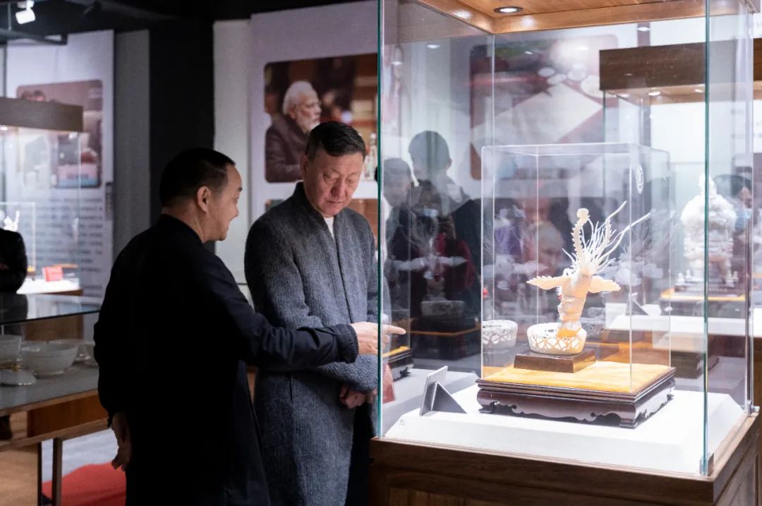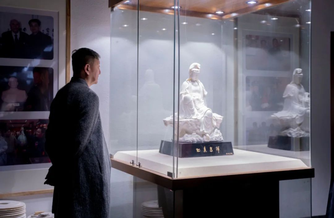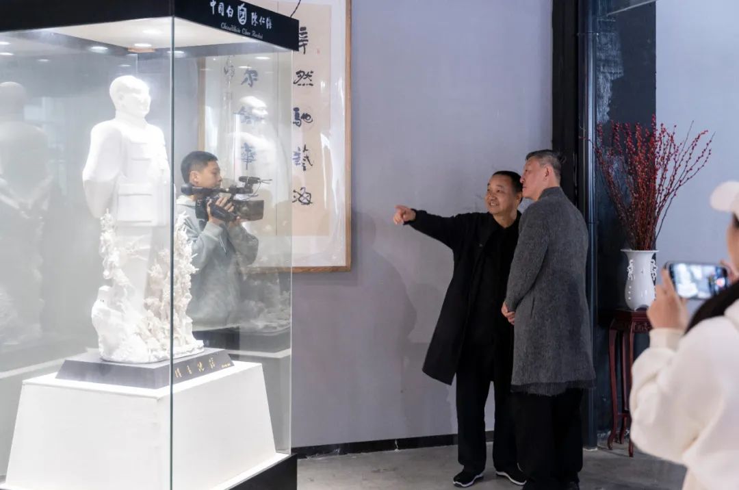 隨后,韓磊老師一行饒有興致的鑒賞了中國(guó)白陳仁海團(tuán)隊(duì)創(chuàng)作的《紫歸牡懷》《閩龍出!贰墩l(shuí)主沉浮》《夢(mèng)回大唐》《點(diǎn)亮世界》《開(kāi)拓輝煌》等一系列見(jiàn)證國(guó)家發(fā)展歷程,貼近時(shí)代、貼近生活、貼近群眾,富有時(shí)代特征的瓷雕藝術(shù)作品,近距離感受中國(guó)白陳仁海團(tuán)隊(duì)堅(jiān)持“中國(guó)白”文化自信,三十年只做一件事——復(fù)興中國(guó)白,引領(lǐng)“中國(guó)白”文化走向世界的創(chuàng)作初心以及中國(guó)白陳仁海團(tuán)隊(duì)與國(guó)家同命運(yùn)共呼吸、融史于瓷、精雕細(xì)琢、精益求精的創(chuàng)作匠心。