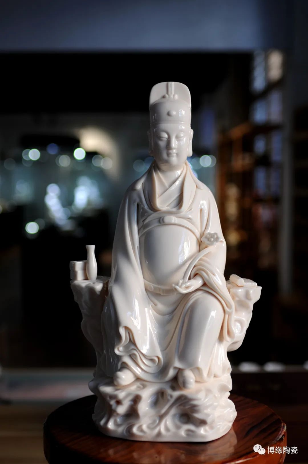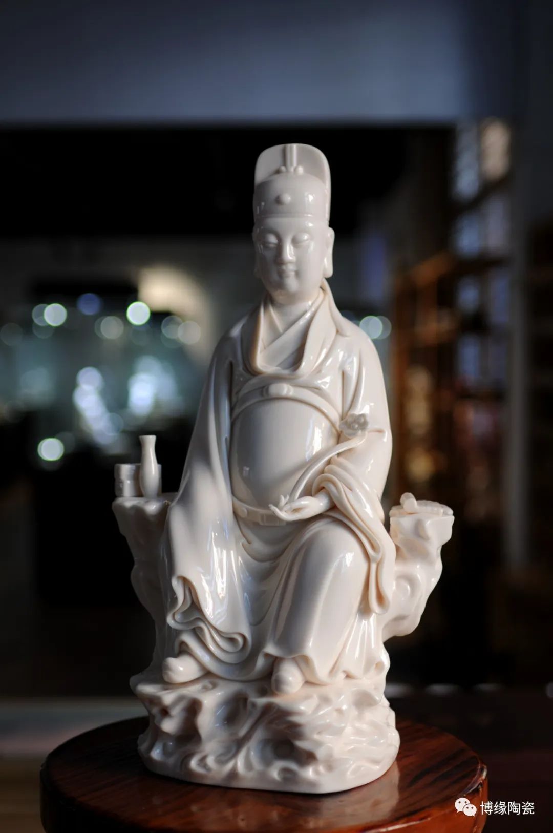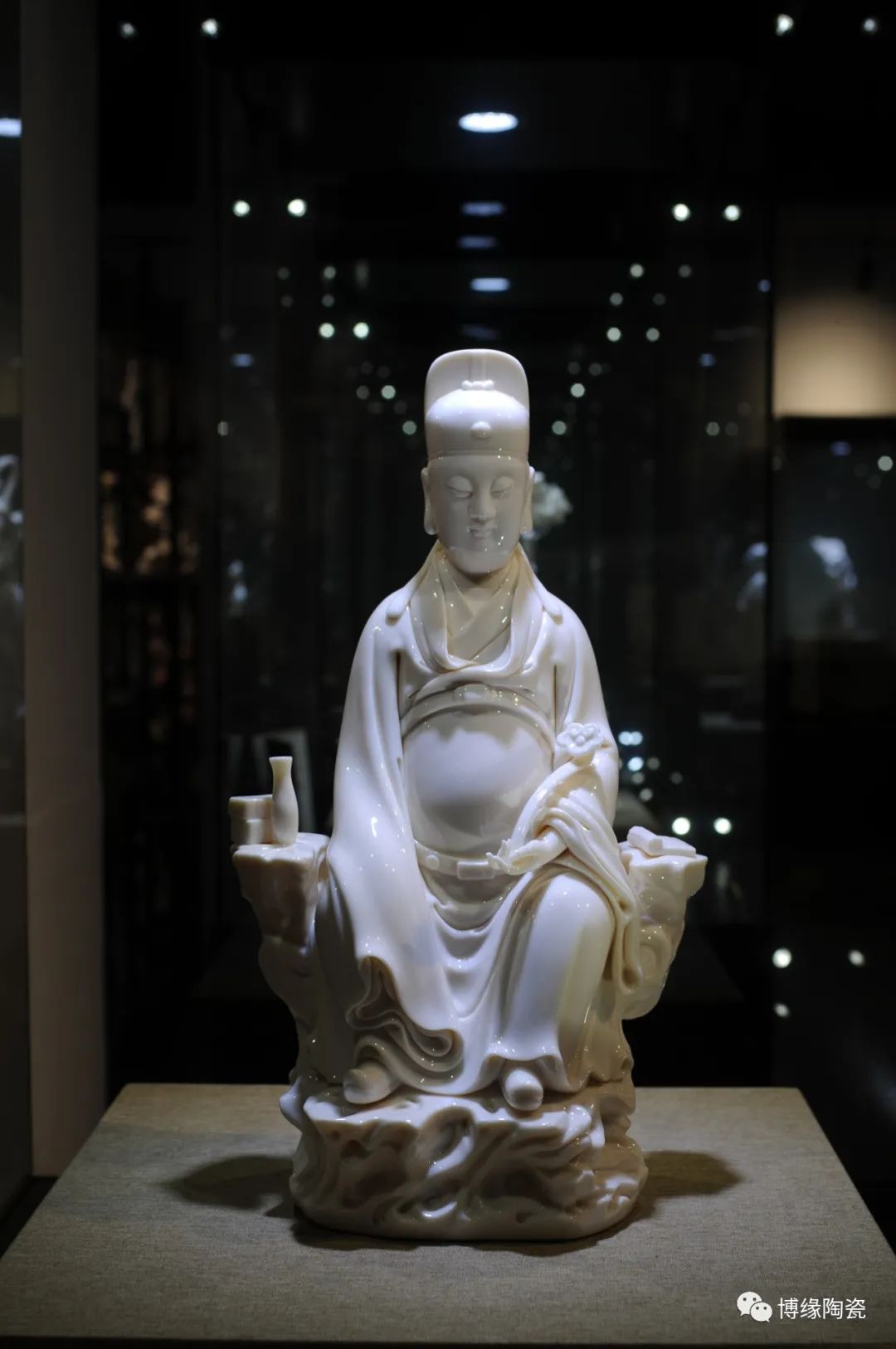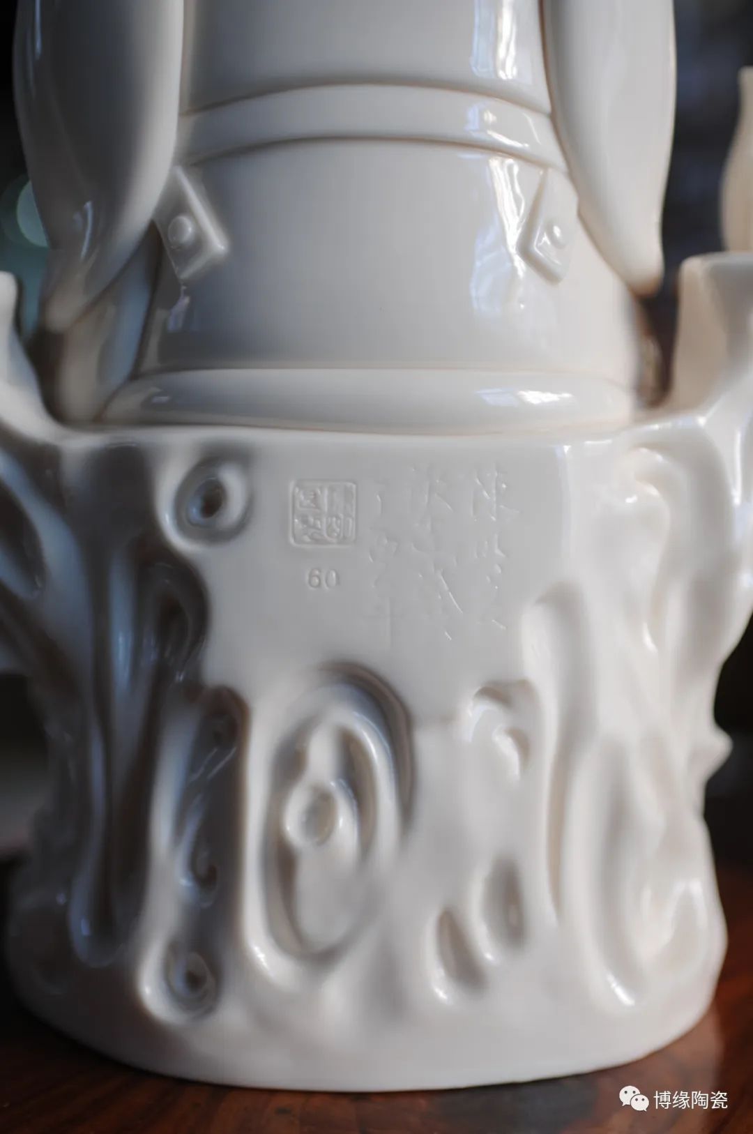 作品采用德化優(yōu)質(zhì)高嶺土,經(jīng)1300多度高溫?zé)疲商貪?rùn)似玉透光性強(qiáng)。作品傳承明代何派技法,以熟練的雕塑技巧和豐富的生活體驗(yàn),賦予文昌以鮮活的生命,使之更加世俗化、生活化,具有超凡脫俗之軒昂器宇,至今仍洋溢著感人的藝術(shù)魅力。衣紋刻劃線條深秀,簡(jiǎn)潔瀟灑,變化多端且柔和流暢。文昌帝君坐于巖石之上,頭戴唐巾(又稱進(jìn)士冠),兩巾角縛于后分垂頸肩;國(guó)字形臉龐,丹鳳眼,大耳,嘴角四周裂縫填充須髯;身穿寬袖長(zhǎng)袍,一手執(zhí)如意,一手自然下垂,雙足蹬靴微露;右側(cè)放有書卷,左側(cè)放有凈瓶代表平安,整件作品極富層次變化。瓷雕作品胎白,堅(jiān)實(shí)厚重,質(zhì)感瑩潤(rùn),是一件難得的收藏佳作。