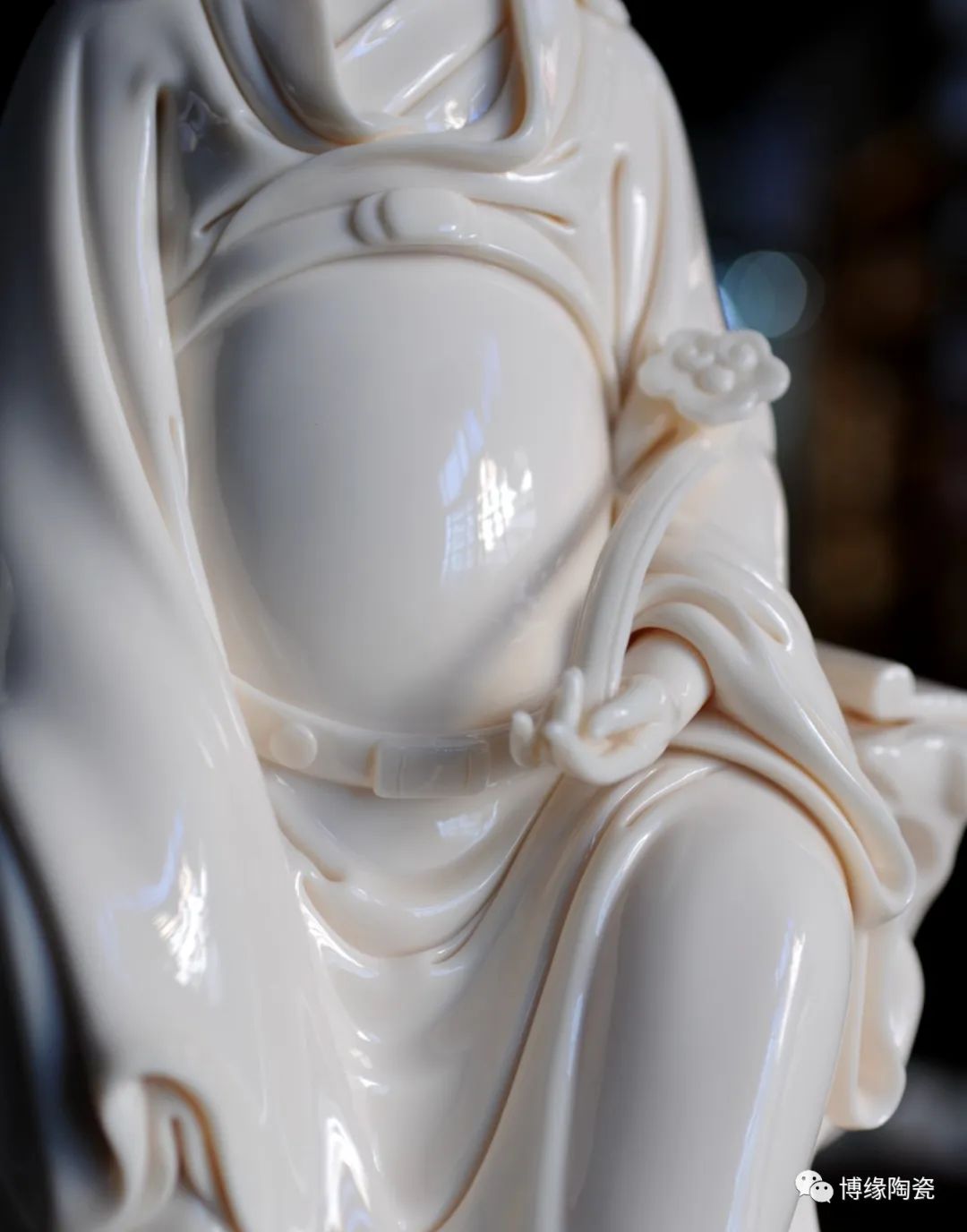 早在明代德化白瓷佛像就名聲在外,一代“瓷圣”何朝宗佛像名作流傳后世,成為世界各大博物館收藏的珍品,更對(duì)佛像雕塑史上產(chǎn)生深遠(yuǎn)的影響,形成“何派”雕塑,其開創(chuàng)的捏、塑、雕、刻、刮、削、接、貼八字技法延用至今。何派觀音雕塑注重于細(xì)節(jié)之美,精益求精,故而十分著意衣紋的刻畫,使線條流暢,翻轉(zhuǎn)自然。觀其佛像,仿佛有春風(fēng)拂面,衣袂飄揚(yáng)的出塵之感!