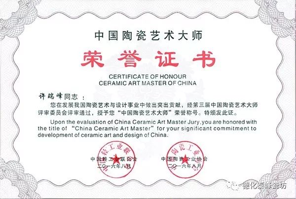 作品配有中國工藝美術(shù)大師許瑞峰收藏證書及榮譽證書