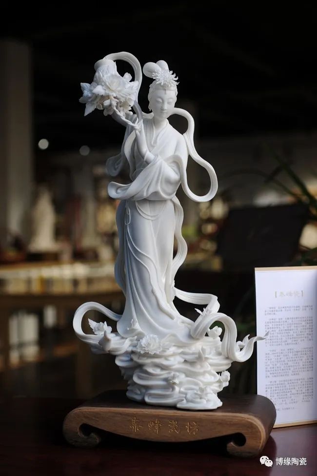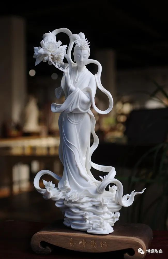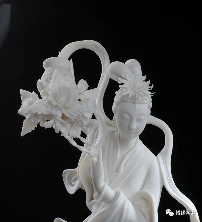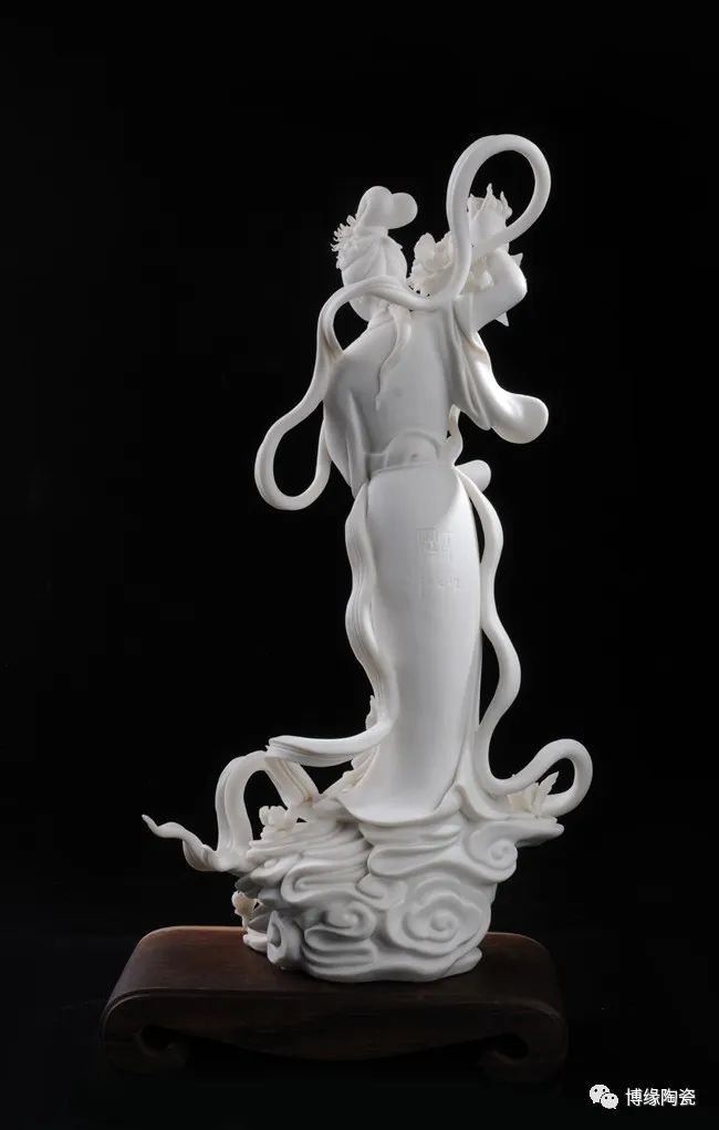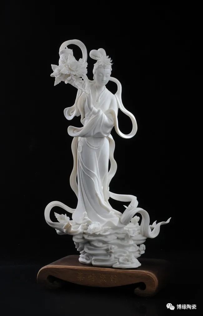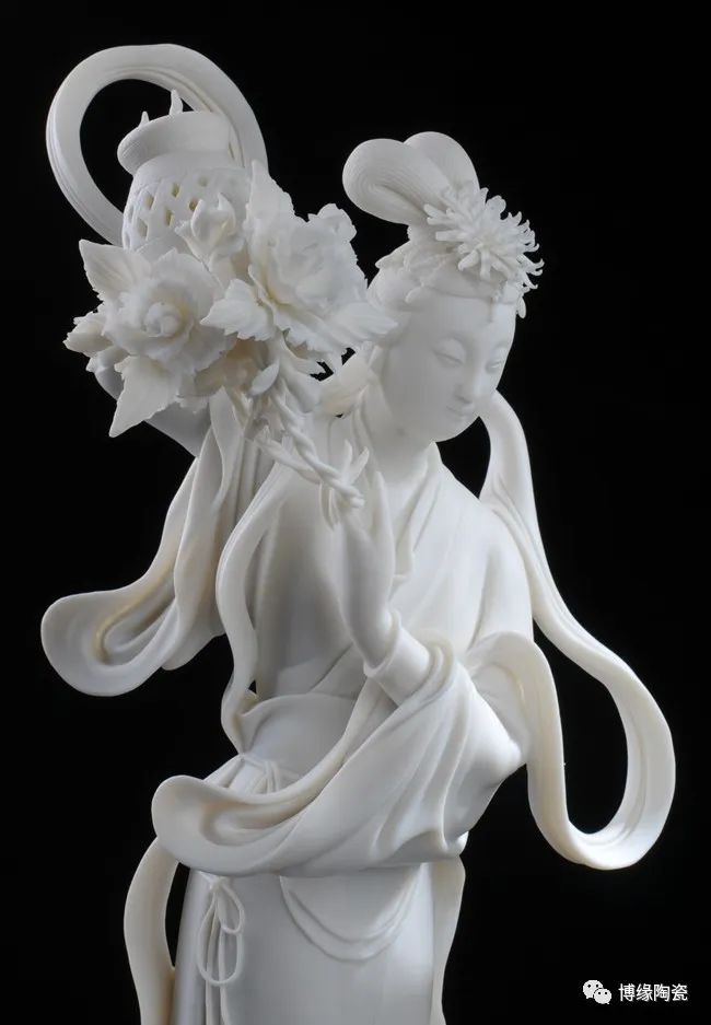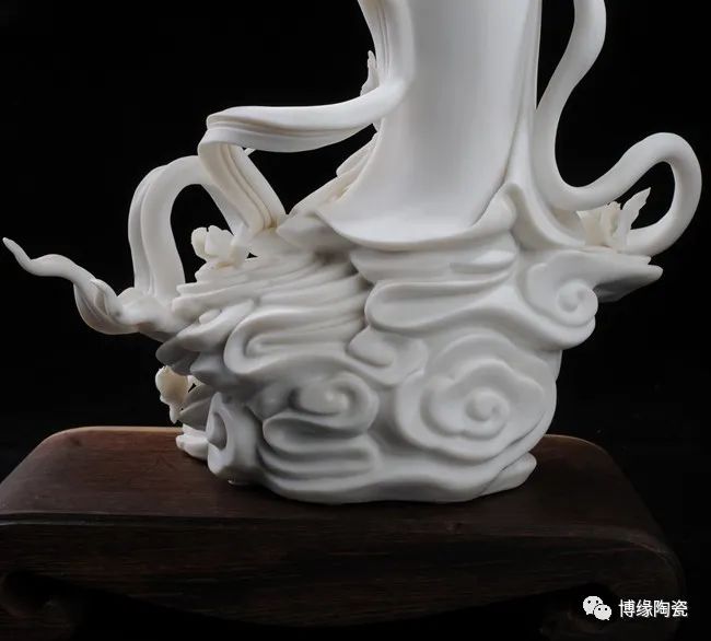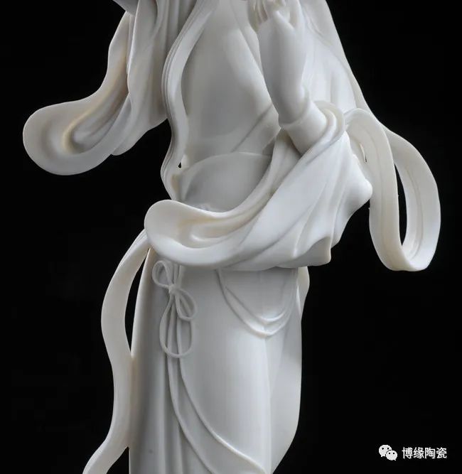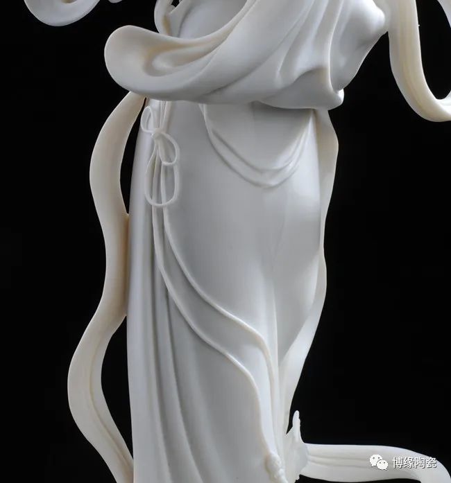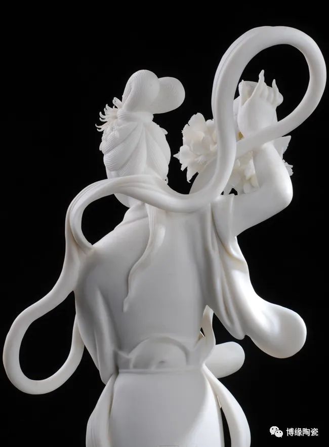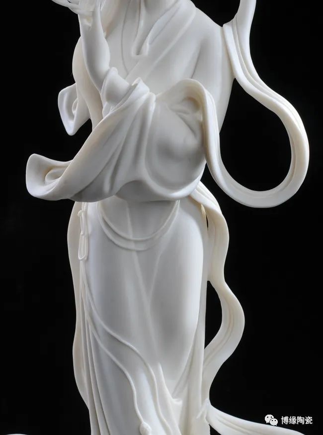 德化是“中國白的故鄉(xiāng)”,在世界瓷壇獨(dú)樹一幟,被稱為“世界白瓷之母”,德化白瓷溫潤、明凈、典雅、精巧,被稱“象牙白”、“鵝絨白”,素有“世界白瓷看中國,中國白瓷看德化”之稱。早在明代德化白瓷就名聲在外,一代“瓷圣”何朝宗名作流傳后世,成為世界各大博物館收藏的珍品,更對雕塑史上產(chǎn)生深遠(yuǎn)的影響,形成“何派”雕塑,其開創(chuàng)的捏、塑、雕、刻、刮、削、接、貼八字技法延用至今。何派雕塑注重于細(xì)節(jié)之美,精益求精,故而十分著意衣紋的刻畫,使線條流暢,翻轉(zhuǎn)自然。觀其作品仿佛有春風(fēng)拂面,衣袂飄揚(yáng)的出塵之感。