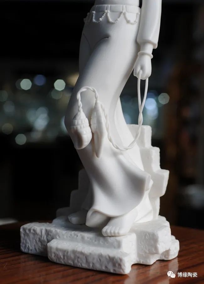 早在明代德化白瓷就名聲在外,一代“瓷圣”何朝宗名作流傳后世,成為世界各大博物館收藏的珍品,更對雕塑史上產生深遠的影響,形成“何派”雕塑,其開創(chuàng)的捏、塑、雕、刻、刮、削、接、貼八字技法延用至今。何派雕塑注重于細節(jié)之美,精益求精,故而十分著意衣紋的刻畫,使線條流暢,翻轉自然。觀其作品仿佛有春風拂面,衣袂飄揚的出塵之感。