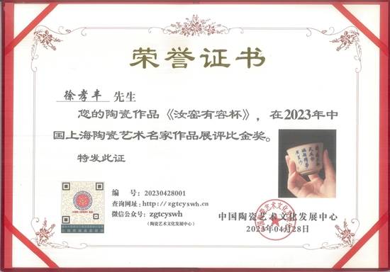 近日,徐孝豐《汝窯有容杯》榮獲2023年中國上海陶瓷藝術(shù)名家作品展評比金獎。