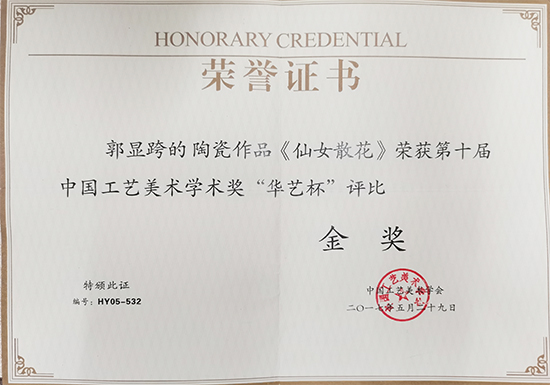 2017年05月《仙女散花》榮獲第十屆中國(guó)工藝美術(shù)學(xué)術(shù)獎(jiǎng)“華藝杯”評(píng)比金獎(jiǎng)。