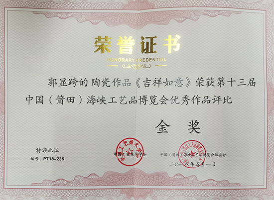 2018年05月《吉祥如意》榮獲第十三屆中國(guó)(莆田)海峽工藝品博覽 會(huì)優(yōu)秀作品評(píng)比金獎(jiǎng);