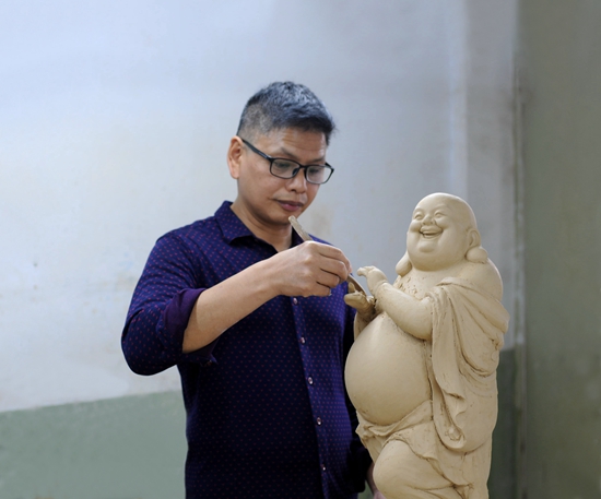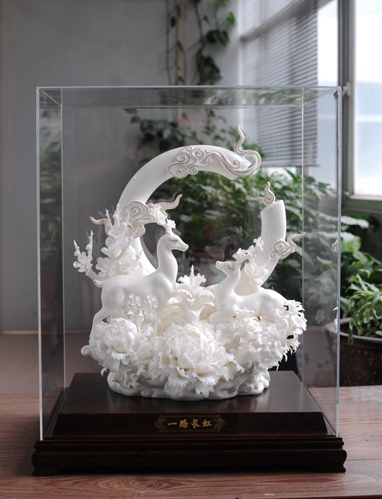 郭顯跨從小深受陶瓷文化熏陶,完成學(xué)業(yè)后開始專注陶瓷雕塑創(chuàng)作,經(jīng)過20多年的學(xué)習(xí)與積累,其精通制瓷各工序,熟練掌握雕塑、捏花、制釉、燒制等技藝。所創(chuàng)作品精選優(yōu)質(zhì)瓷泥,用心配制,以1300多度高溫?zé)贫,瓷胎?xì)膩堅(jiān)致,色溫潤(rùn)如玉,剔透光滑,猶如雪白霜凝,釉面光滑,擊聲如磐。