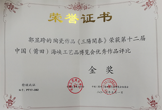 2017年07月《三陽開泰》榮獲第十二屆中國(guó)(莆田)海峽工藝品博覽 會(huì)優(yōu)秀作品評(píng)比金獎(jiǎng);