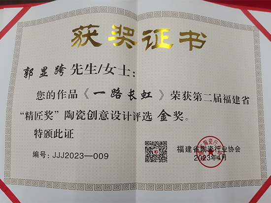 2023年04月《一路長(zhǎng)虹》榮獲第二屆福建省“精匠獎(jiǎng)”陶瓷創(chuàng)意設(shè)計(jì) 評(píng)選金獎(jiǎng);