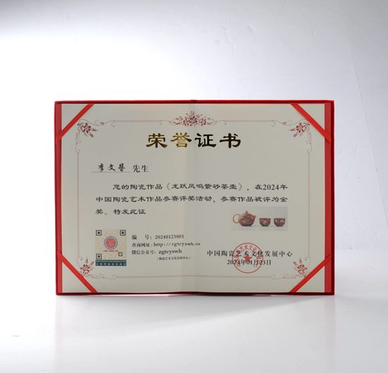 2024年作品《龍躍鳳鳴紫砂茶壺》榮獲北京中國(guó)陶瓷藝術(shù)名家作品展金獎(jiǎng)