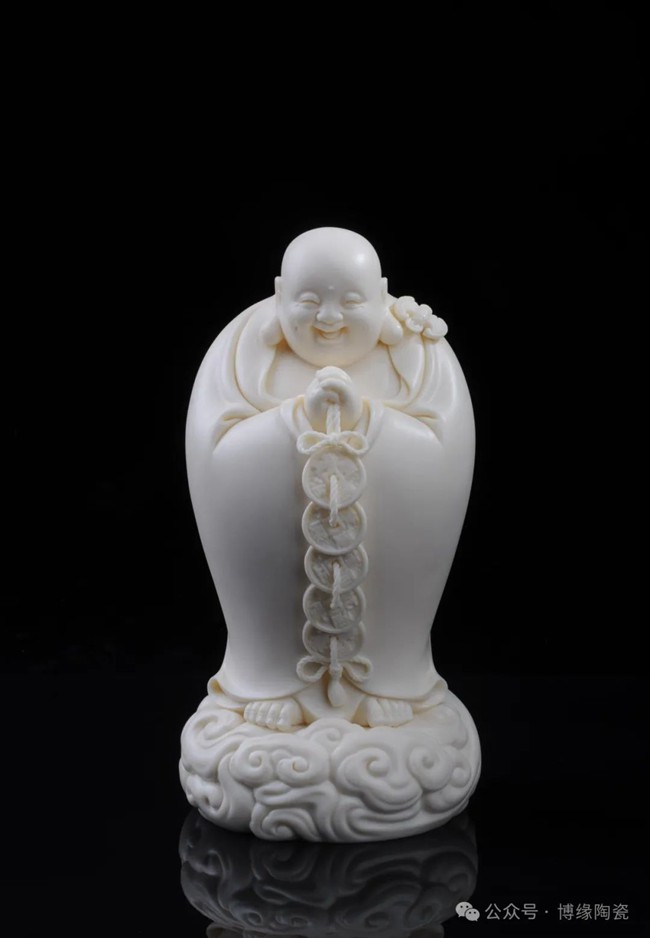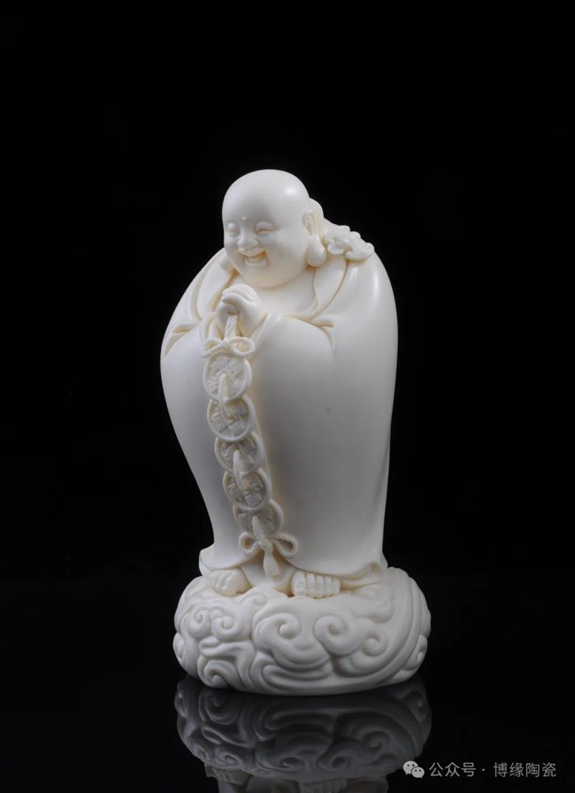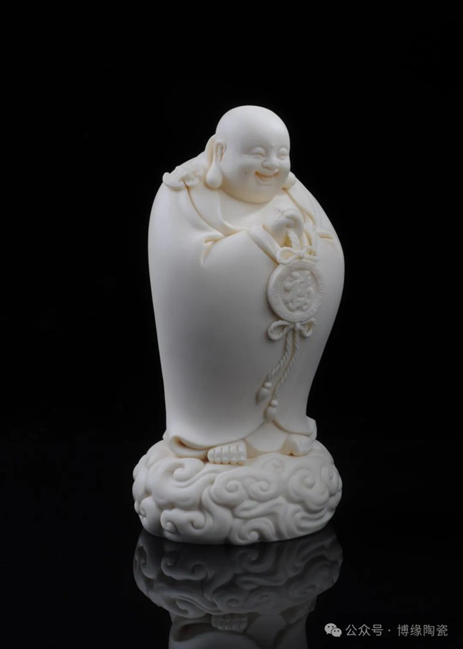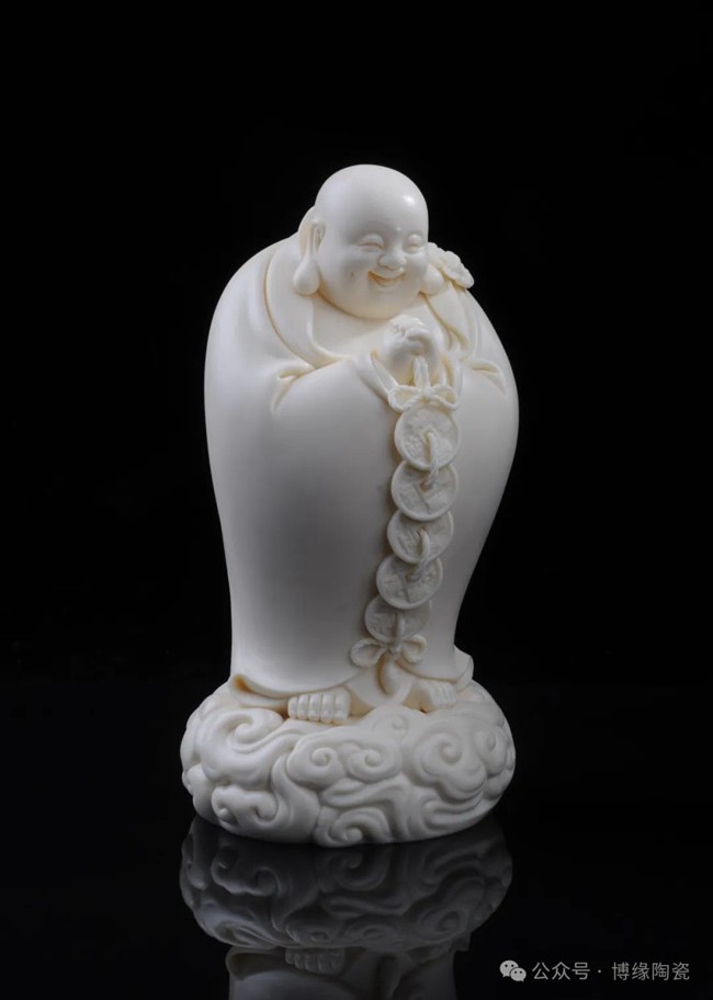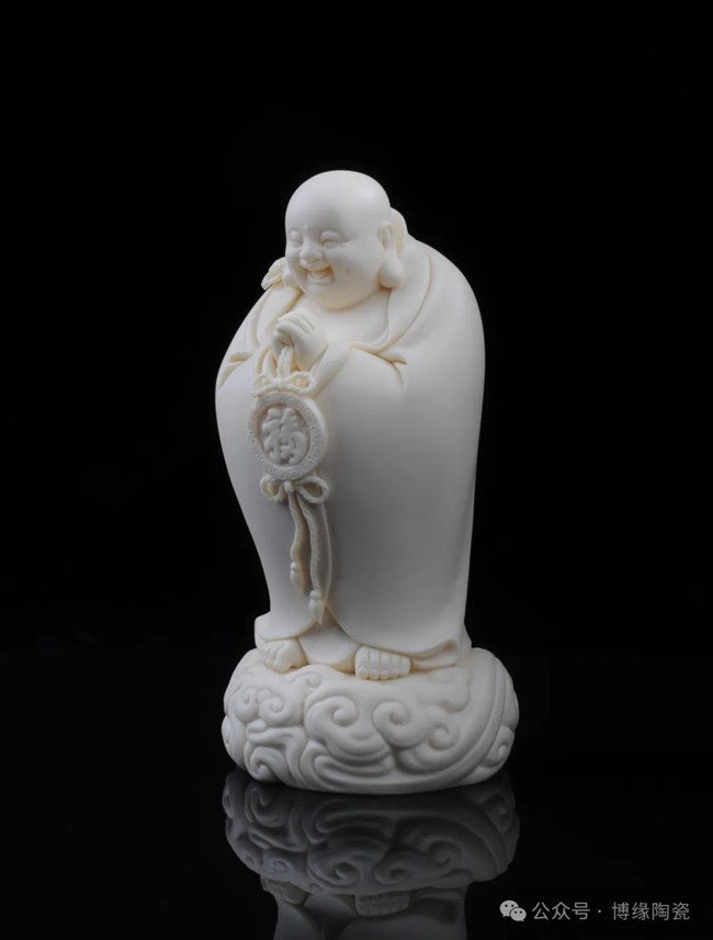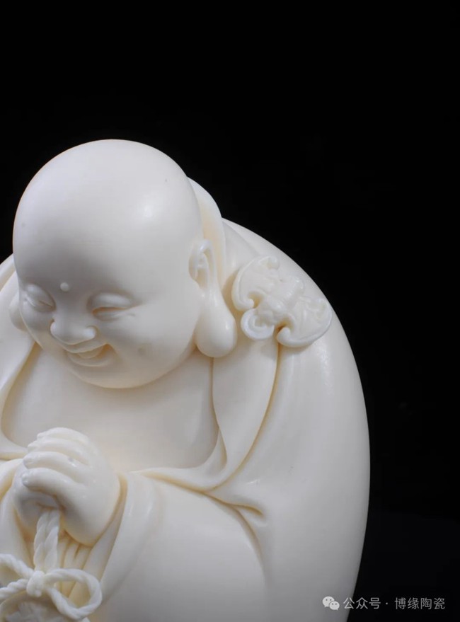 彌勒佛則是德化白瓷佛像里常見(jiàn)題材之一,特別以何朝宗為代表的風(fēng)格作品,其雕塑注重于細(xì)節(jié)之美,精益求精,故而十分著意衣紋的刻畫,使線條流暢,翻轉(zhuǎn)自然。觀其佛像,仿佛有春風(fēng)拂面,衣袂飄揚(yáng)的出塵之感。