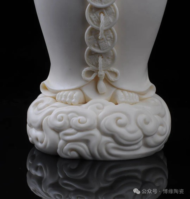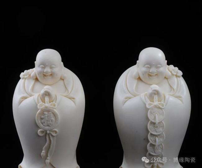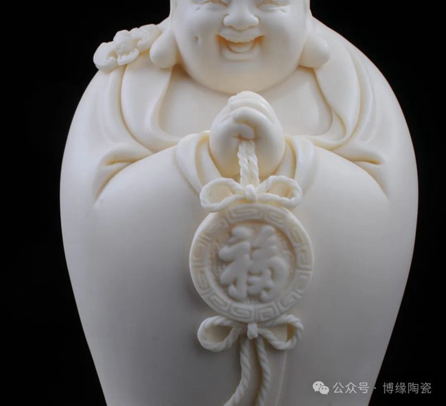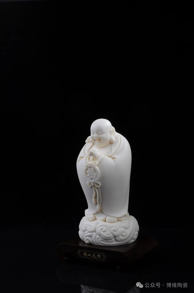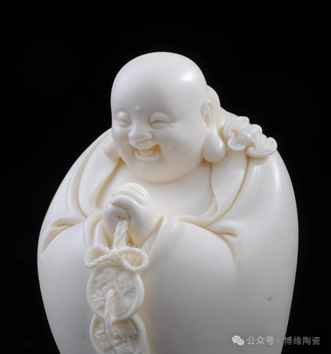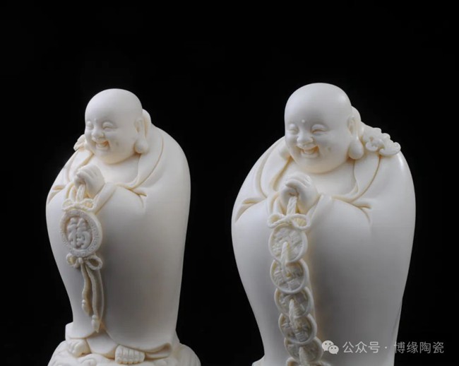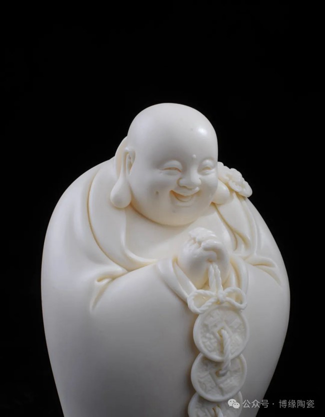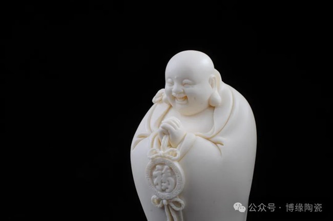 彌勒佛則是德化白瓷佛像里常見(jiàn)題材之一,特別以何朝宗為代表的風(fēng)格作品,其雕塑注重于細(xì)節(jié)之美,精益求精,故而十分著意衣紋的刻畫,使線條流暢,翻轉(zhuǎn)自然。觀其佛像,仿佛有春風(fēng)拂面,衣袂飄揚(yáng)的出塵之感。