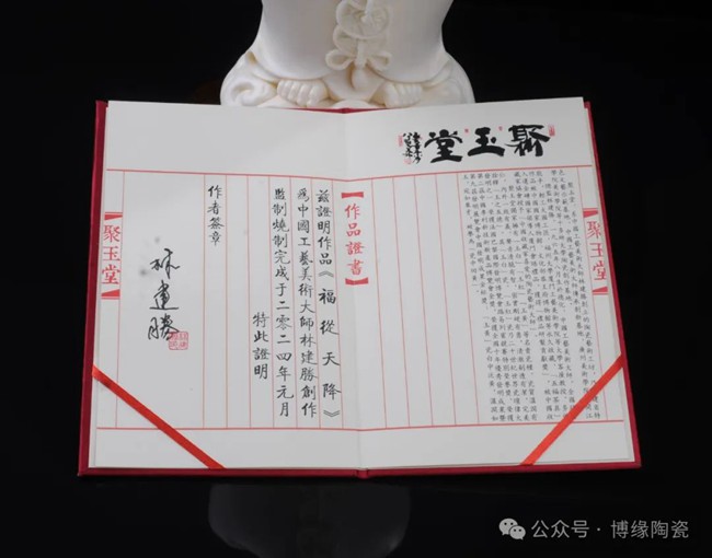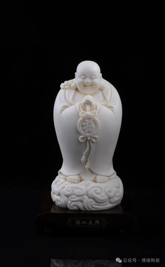《福從天降》作品由中國(guó)工藝美術(shù)大師林建勝設(shè)計(jì)創(chuàng)作,采用德化玉黃瓷為材質(zhì),溫潤(rùn)如玉;以福文化為底蘊(yùn)創(chuàng)作。作品雕刻精細(xì),彌勒佛面容飽滿,喜笑顏開(kāi),酒窩深陷,大耳垂肩,彌勒立于祥云之上,雙手相握顯現(xiàn)出恭喜之勢(shì),手握中國(guó)結(jié)“福”或“錢幣”。作品把彌勒刻畫得細(xì)膩、生動(dòng)、傳神、喜慶。背面落有林建勝大師個(gè)人印章款,是書(shū)房、客廳、辦公室裝飾擺件,也是收藏、禮贈(zèng)的好選擇。