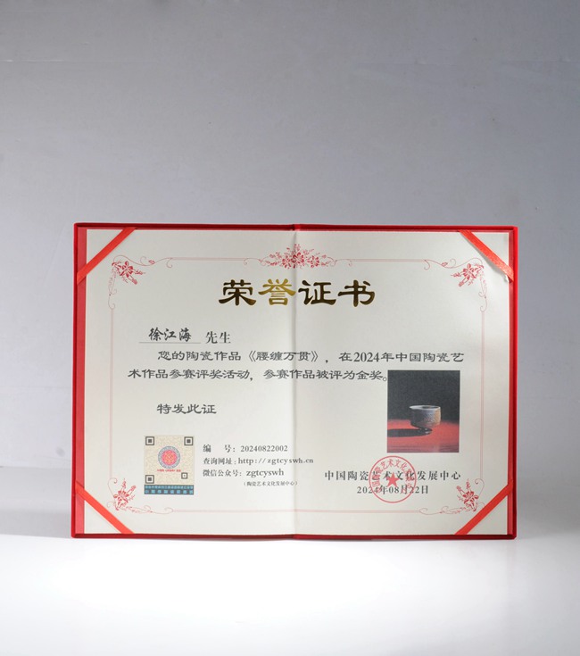 徐江海從事陶瓷設(shè)計(jì)創(chuàng)作10多年,主要作品有手拉胚茶器、純手工茶器、柴燒茶器、紫砂茶具、羊脂玉茶具等。作品多次獲得國(guó)內(nèi)各評(píng)比大賽金獎(jiǎng),2024年榮獲“中國(guó)陶瓷藝術(shù)非遺傳承人”, 作品《腰纏萬貫》榮獲2024年中國(guó)國(guó)際(北 京)陶瓷藝術(shù)名家精品展作品評(píng)比金獎(jiǎng),其作品深 受廣大客商、藏家青睞,廣受好評(píng)。