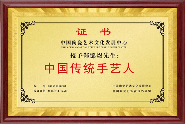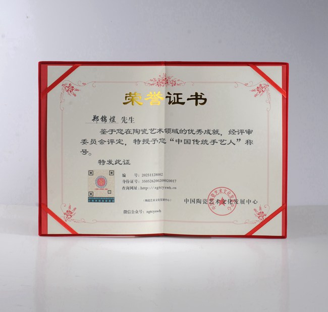 鄭錦煜以“守正創(chuàng)新”為核心理念,他在傳承古老技藝的同時,不斷創(chuàng)新,其作品將德化陶瓷特有的溫潤質(zhì)感,與金屬掐絲的骨架結(jié)構(gòu)和琺瑯釉的璀璨光澤融為一體,形成了獨具個人特色的“絲釉共生”藝術(shù)效果,拓展了陶瓷藝術(shù)的表現(xiàn)語言。在藝術(shù)表達上,他突破了傳統(tǒng)琺瑯工藝多以花鳥、圖案為裝飾主題的局限,大膽地將德化經(jīng)典的佛教人物造像(如觀音、羅漢)等主題引入創(chuàng)作,并以現(xiàn)代審美理念進行重構(gòu),使作品既承載傳統(tǒng)精神,又符合當(dāng)代審美。