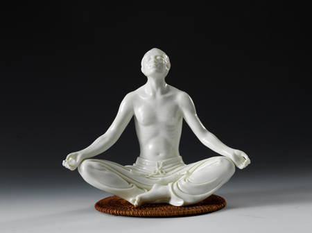 這就是不滿足于停留在傳承層面上,而是不斷開闊自己的眼界與識(shí)度,自覺地在文化修養(yǎng)、社會(huì)活動(dòng)與人生閱歷等方面充實(shí)自己,形成自己更加開放的心境與更加豁達(dá)的胸懷,形成從工到藝、以藝帶工的思想升華,從而走出一條具有鮮明時(shí)代特征與個(gè)性情懷的瓷塑創(chuàng)造之途。《禪心》系列作品便是在傳統(tǒng)之余的創(chuàng)新之作。人物盤膝而坐,雙手?jǐn)傞_輕輕放在膝蓋上,頭微仰面向天空,眼睛微閉,靜心之意撲面而來。此作品借鑒了瑜伽的姿勢(shì)造型,卻在精雕細(xì)刻與抽象寫意之間相生相融,相輔相成。