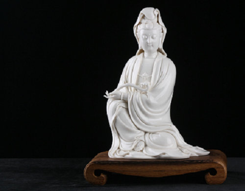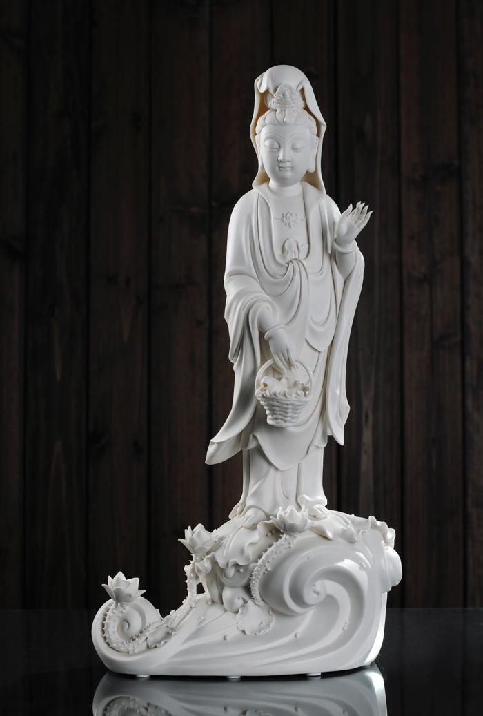 此尊觀音像高47厘米,底長24厘米,寬16厘米,頭髻發(fā)束,面容慈祥,寬袖衣裙、手提竹籃、腳踏鰲背,釉面光潤明亮,胎質(zhì)致密透光,雕塑精細(xì),采用堆花、貼花、鏤空、刻畫等多種工藝,使觀音衣褶裙帶線條流暢、洗練,形象栩栩如生。