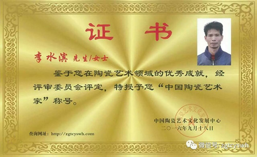 2016年經中國陶瓷藝術文化發(fā)展中心評審委員會評定為“中國陶瓷藝術家”。