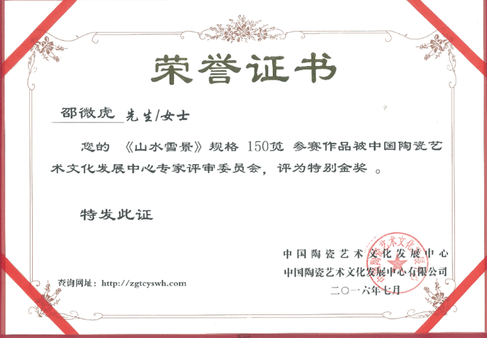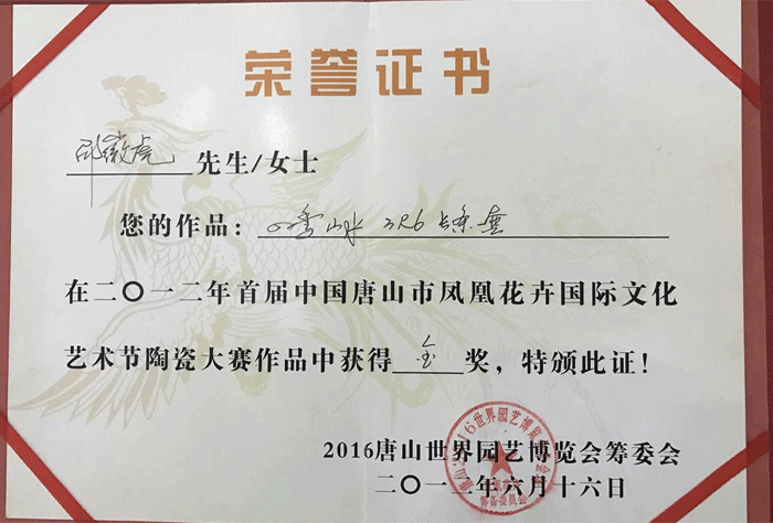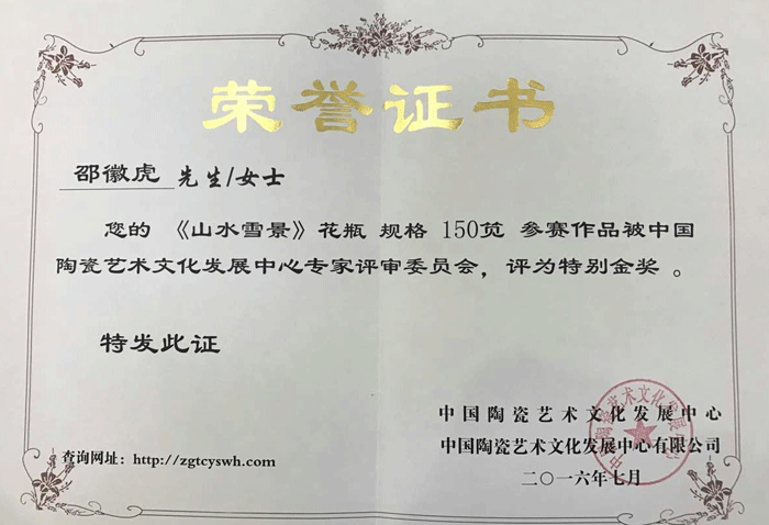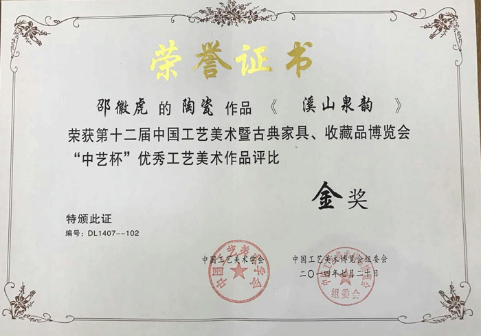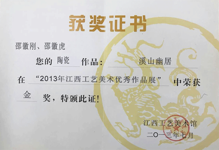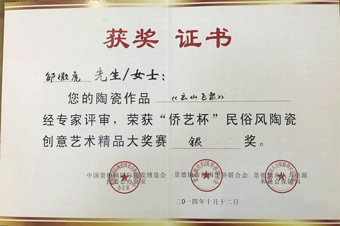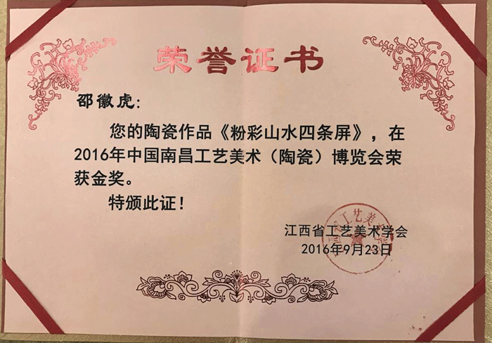 其作品多次獲省市各類金銀獎(jiǎng)項(xiàng),以構(gòu)圖嚴(yán)謹(jǐn)、筆法老道、韻意十足,深受各界陶瓷愛好者的好評(píng)及爭相收藏。