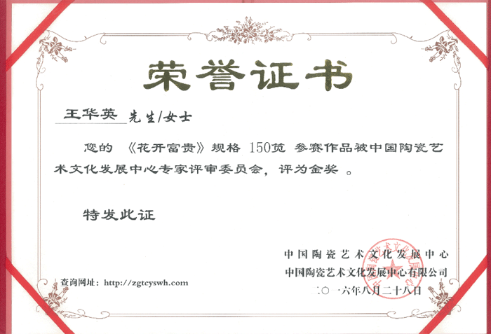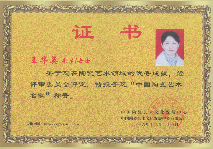 2016年經(jīng)中國(guó)陶瓷藝術(shù)文化發(fā)展中心評(píng)審委員會(huì)評(píng)定為"中國(guó)陶瓷藝術(shù)名家".