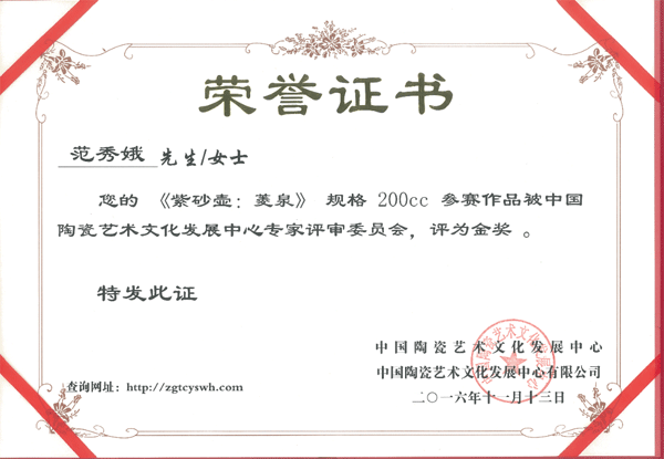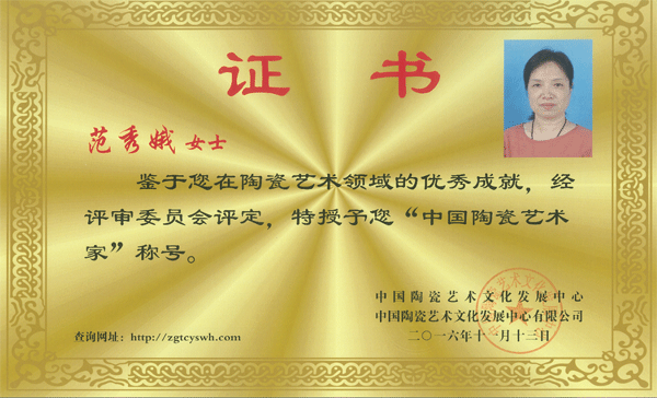 2016年經(jīng)中國陶瓷藝術(shù)文化發(fā)展中心評審委評定為“中國陶瓷藝術(shù)家”。 |