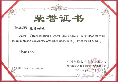 2016年8月30日參賽作品《坐巖彌勒佛》被中國陶瓷藝術(shù)文化發(fā)展中心評(píng)為"特別金獎(jiǎng)"