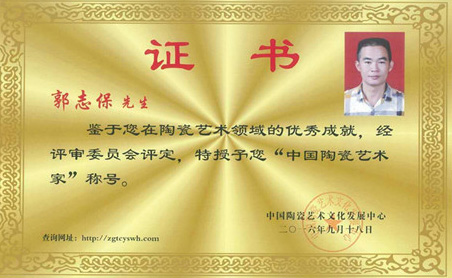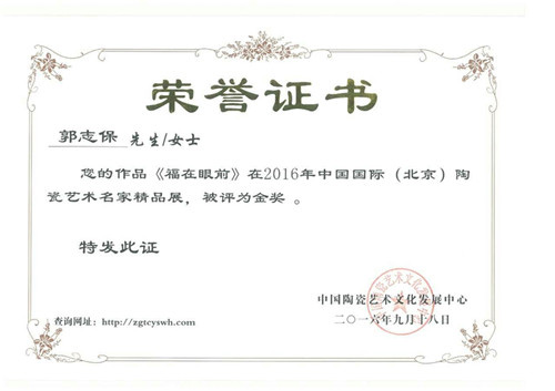 2016年經(jīng)中國陶瓷藝術(shù)文化發(fā)展中心評審委員會評定為“中國陶瓷藝術(shù)家”。