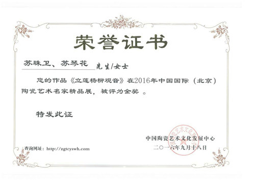 作品《麒麟送子觀音》參加 2016年中國國際(北京)陶瓷藝術(shù)名家精品展作品評比榮獲“特別金獎(jiǎng)”。