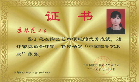 2016年經(jīng)中國陶瓷藝術(shù)文化發(fā)展中心評審委員會評定為“中國陶瓷藝術(shù)家”。