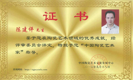 2001至2009年于泉州南城工藝從事設(shè)計雕塑,2010年創(chuàng)辦建評陶坊至今 作品《弘一法師》參加第二屆北京(國際)陶瓷藝術(shù)名家作品展評比榮獲“特別金獎” 2016年經(jīng)中國陶瓷藝術(shù)文化發(fā)展中心評審委員會評定為“中國陶瓷藝術(shù)家”。