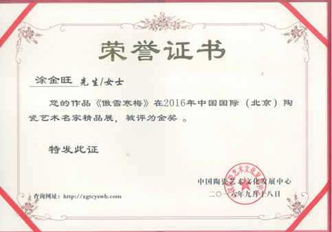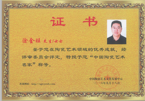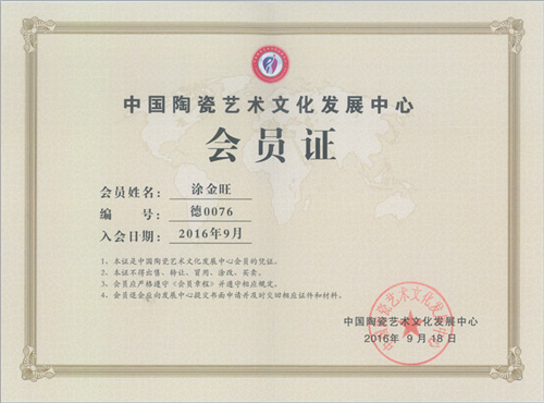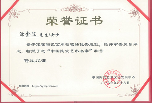2017年經(jīng)中國(guó)陶瓷藝術(shù)文化發(fā)展中心專家評(píng)審委員會(huì)評(píng)定為“中國(guó)陶瓷藝術(shù)名家”