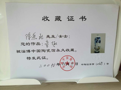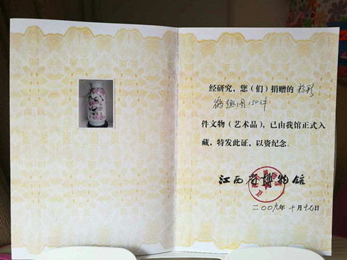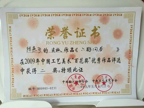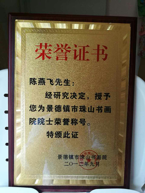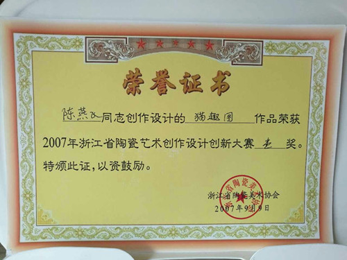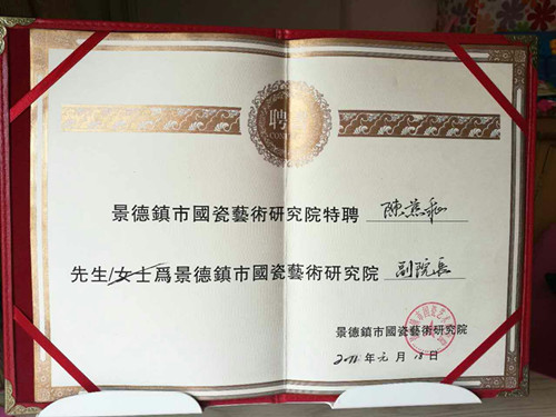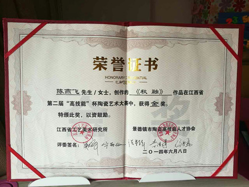 2105年經(jīng)中國陶瓷藝術(shù)文化發(fā)展中心評審委員會與江西省工藝美術(shù)學(xué)會共同評定為“中國陶瓷藝術(shù)家”。