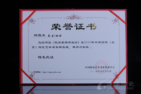2016年作品《民族英雄-鄭成功》參加中國國際(北京)陶瓷藝術(shù)名家精品展作品評(píng)比榮獲“金獎(jiǎng)”