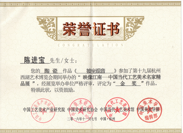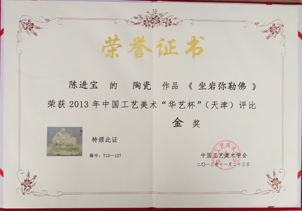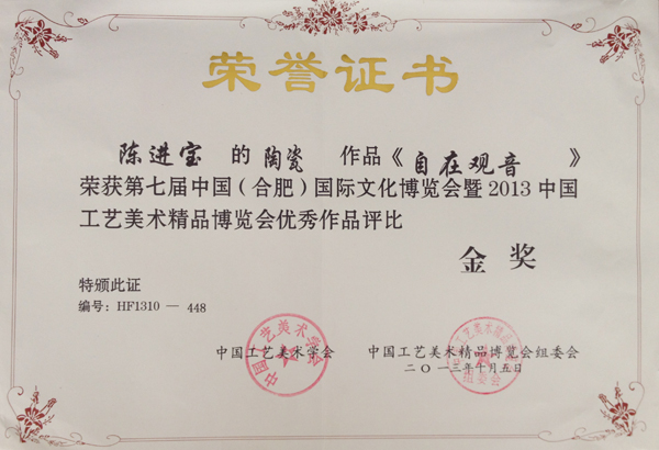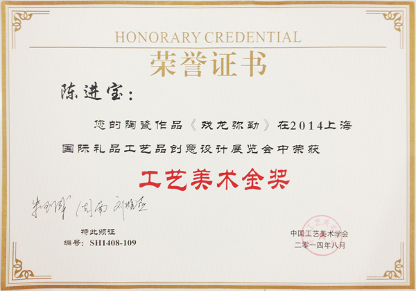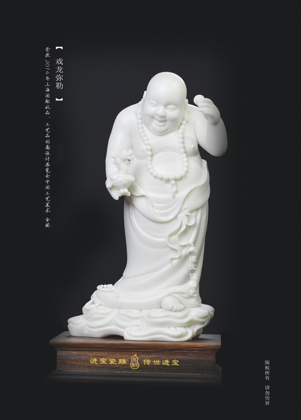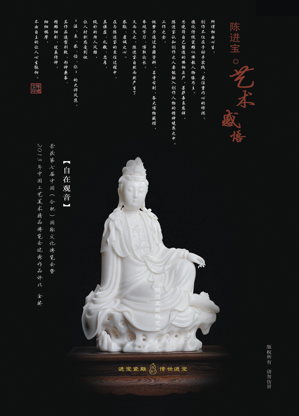 個(gè)人簡(jiǎn)介: 陳進(jìn)寶:男,中國(guó)陶瓷藝術(shù)名家、福建省陶瓷藝術(shù)大師,高級(jí)工藝美術(shù)師,1959年出生于瓷都德化,上世紀(jì)70年代就與瓷結(jié)緣,師從中國(guó)工藝美術(shù)大師、中國(guó)陶瓷藝術(shù)大師、國(guó)家級(jí)非物質(zhì)遺產(chǎn)文化傳承人蘇清河三十余年,為德化陶瓷文化和傳統(tǒng)瓷雕技藝有著深厚的感情和獨(dú)到的領(lǐng)悟。從藝40年來(lái),陳進(jìn)寶務(wù)實(shí)創(chuàng)新,孜孜以求,為“傳統(tǒng)寫意”的藝術(shù)手法,微妙的表現(xiàn)人物的內(nèi)心世界,塑造的人物形象既有共同特征,又有不同個(gè)性,形神兼?zhèn)洌挥兴囆g(shù)魅力。