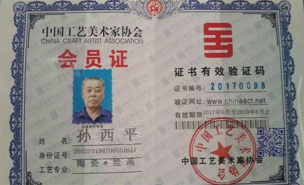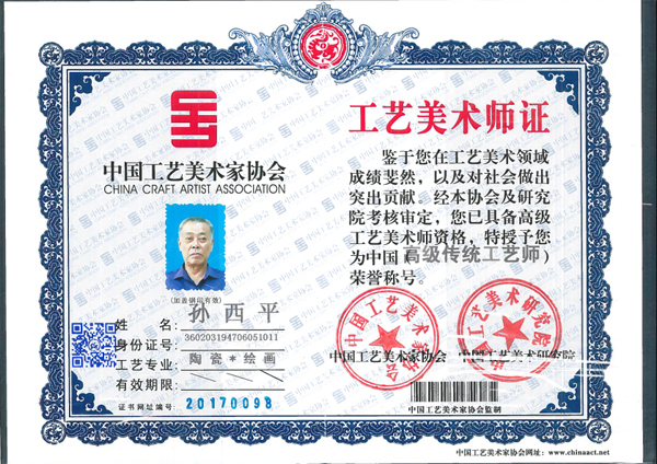 其作品深得陶瓷藏家和行家賞識、喜愛。2017年被中國工藝美術(shù)家協(xié)會評審為“高級傳統(tǒng)工藝師”。