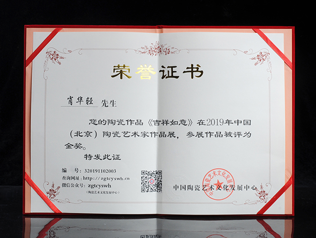 肖華輕從事陶瓷創(chuàng)作10多年,主要作品有茶具、茶壺、佛象、家居花瓶、人物雕塑等。作品多次獲得國內(nèi)各評(píng)比大賽金獎(jiǎng),2019年獲評(píng)“中國陶瓷藝術(shù)家”,作品《吉祥如意》榮獲2019年中國國際(北 京)陶瓷藝術(shù)名家精品展作品評(píng)比金獎(jiǎng)、作品《和氣生財(cái)》榮獲2019年中國國際(北 京)陶瓷藝術(shù)名家精品展作品評(píng)比金獎(jiǎng)等,其作品深受收藏家及有識(shí)之士青睞,廣受好評(píng)。