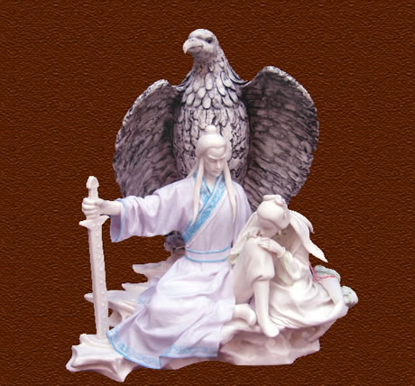 瓷雕作品上的神雕微展雙翅,雙眼炯炯有神,注視前方。神雕的下面是楊過和小龍女這對俠侶。楊過盤腿坐在巖石上,右手握著劍,盡現(xiàn)大俠風范;小龍女偎依在楊過身邊,柔情萬千。整件作品結構嚴謹,雕工精細,神態(tài)逼真,用泥與火的藝術把金庸筆下的《神雕俠侶》充分地體現(xiàn)出來。