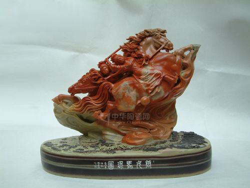 這件作品是迎奧運而雕刻的 “唐女馬球圖”。唐代長安城內(nèi)的馬球運動曾風(fēng)靡一時,還有皇家專門的馬球隊。唐玄宗就曾率領(lǐng)皇家馬球隊擊敗過來訪的波斯馬球隊,這在史籍上有記載的,說明中華民族在古代就喜愛體育運動。作品以青田名貴封門紅花精制而成,表現(xiàn)兩個唐女騎在馬背上有相互爭斗呼應(yīng)的場面。兩人兩騎,一繁一簡,一主一從,虛實輕重,馬的剛猛,仕女的柔美,一剛一柔形成對比強烈的生機和意趣。