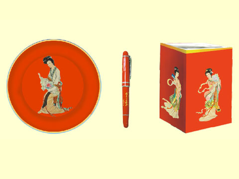 中國紅八寸盤/鋼筆/方型筆筒套裝