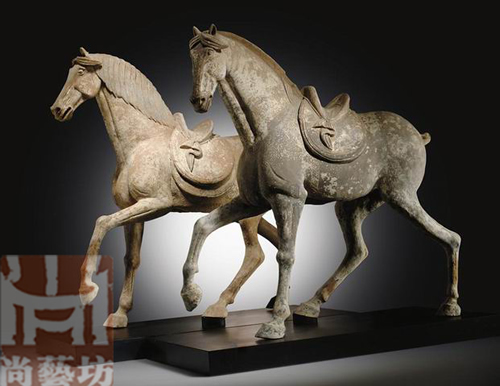 | 一對馬陶俑 | | 唐代 AD 618-907 | | 高:46cm | | 長: 48cm | | 寬:27cm |