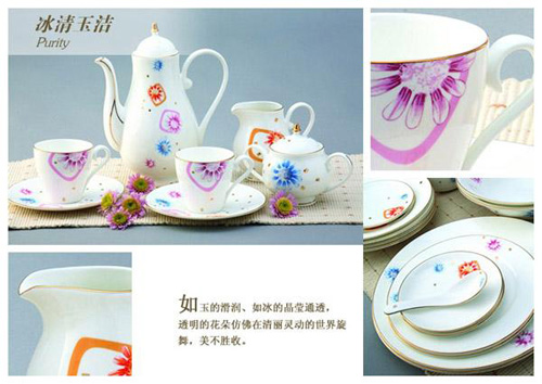 【品名】冰清玉潔餐具茶具 【材質】高白強化骨瓷,經(jīng)過1380度高溫燒制而成,聲音清脆 【規(guī)格】60頭 【等級】一等精品 【包裝】禮品盒