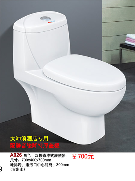 A026白色 雙按直沖式座便器 ¥700元 尺寸:700*400*700mm 地排污、排污口中心距離:300mm(直出水) |
