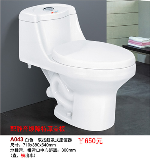 A043 白色 雙按虹吸式座便器 ¥650元 尺寸:710*380*640mm 地排污、排污口中心距離:300mm(直、橫出水) |