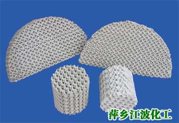 陶瓷波紋填料具有比表面積大、能量大、阻力小、效率高、耐腐蝕、耐高溫(可達(dá)1000℃以上)、操作彈性大、放大效應(yīng)不明顯等優(yōu)點(diǎn),特別適用于對(duì)壓降和理論板數(shù)有嚴(yán)格要求的高溫腐蝕性物料的精餾、吸收等分離過程。 | 理化性能 | 耐酸度 ≥ 99.8% 耐溫度 ≥ 1000℃ | 莫氏硬度 ≥ 7 抗壓強(qiáng)度 ≥ 2.0 Mpa | | 主要技術(shù)指標(biāo): | | 型號(hào) | 比表面積 m2/m3 | 空隙率 kg/m3 | 堆積重量 kg/m3 | 峰高 mm | 波距 mm | 片厚 mm | 理論板數(shù) m-1 | 最大F-因子 m/s.(kg/m3)0.5 | 壓力降 Pa/m | | 450 | 450 | 75 | 520-550 | 6.0±0.5 | 12±0.5 | 1.0-1.3 | 3-4 | 1.8-2.0 | 200-250 | | 400 | 400 | 76 | 500-520 | 7.0±0.5 | 14±0.5 | 1.0-1.3 | 2.8-3.2 | 2.0-2.2 | 180-260 | | 350 | 350 | 78 | 480-520 | 8.0±0.5 | 16±0.5 | 1.2-1.5 | 2.5-2.8 | 2.2-2.6 | 200-260 | | 250 | 250 | 82 | 420-450 | 11.0±0.5 | 22±0.5 | 1.2-1.5 | 2.3-2.5 | 2.6-2.8 | 220-280 | | 160 | 160 | 86 | 350-380 | 17.0±0.5 | 34±0.5 | 1.5-2.0 | 1.8-2.0 | 2.8-3.0 | 250-300 | | 125 | 125 | 87 | 300-350 | 23.0±0.5 | 42±0.5 | 2.0-2.5 | 1.5-1.8 | 3.0-3.2 | 280-350 | | 100 | 100 | 90 | 220-250 | 30.0±0.5 | 50±0.5 | 2.0-2.5 | 1 | 3.5 | 250-300 |